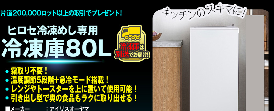 | 家電、冷凍商品、常温商品はそれぞれ別送となります。 商品の到着日が前後する可能性がありますので、あらかじめご了承ください。 ヒロセ冷凍めし専用冷凍庫 ホワイト⁄80Lは、在庫状況によって発送が大幅に遅れる場合がございます。