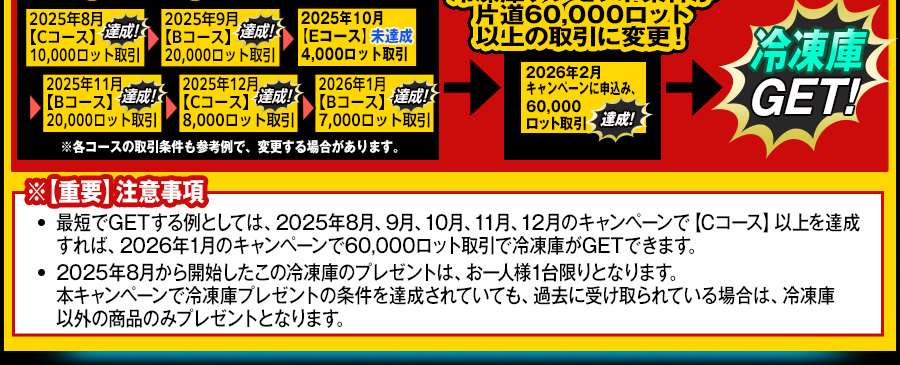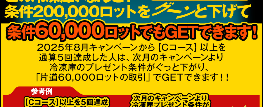【Aコース】 片道200,000ロット以上の取引で 【Bコース】 片道20,000ロット以上の取引で 【Cコース】 片道8,000ロット以上の取引で 【Dコース】 片道6,000ロット以上の取引で 【Eコース】 片道4,000ロット以上の取引で 【Fコース】 片道2,000ロット以上の取引で 【Gコース】 片道1,000ロット以上の取引で 【Hコース】 片道500ロット以上の取引で 【Iコース】 片道100ロット以上の取引で ※ヒロセ冷凍めし専用冷凍庫 ホワイト⁄80L (1台)のプレゼント条件は、2パターンございます。