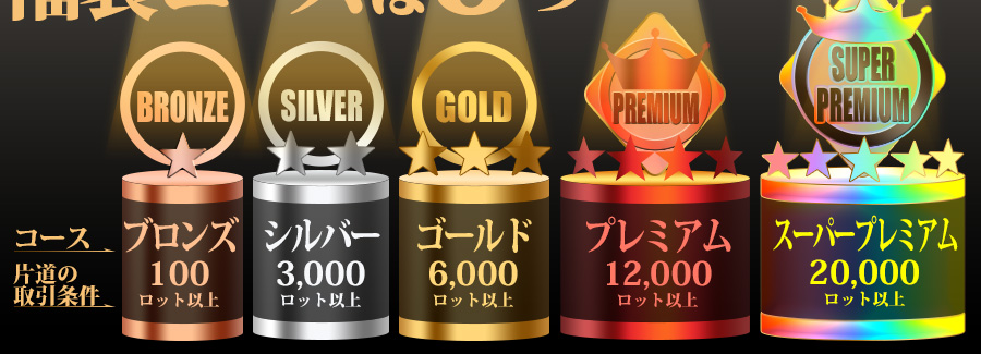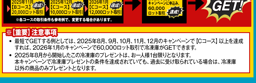 【Aコース】 片道200,000ロット以上の取引で 【Bコース】 片道20,000ロット以上の取引で 【Cコース】 片道12,000ロット以上の取引で 【Dコース】 片道6,000ロット以上の取引で 【Eコース】 片道3,000ロット以上の取引で 【Fコース】 片道100ロット以上の取引で ※スーパープレミアムコースは、プレミアムコースに加え、ふぐ鍋セット、国産松葉蟹、松阪牛ステーキ300g、神戸牛ステーキ300g、国産うなぎの蒲焼、もつ鍋セット、551蓬莱豚まん10個入り、LION FXピザ3種計5枚セットの中のどれか1つをプレゼント! ※2025年12月度キャンペーンでLION FXおせち三段重をGETされた方で、本キャンペーンのプレミアムコースの条件を達成すると格上げとなり、スーパープレミアムコース対象となります! ※ヒロセ冷凍めし専用冷凍庫 ホワイト⁄80L (1台)のプレゼント条件は、2パターンございます。