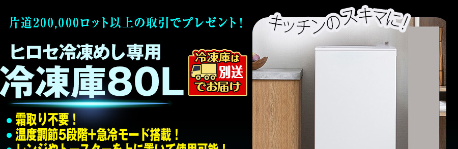 | 家電、冷凍商品、常温商品はそれぞれ別送となります。 商品の到着日が前後する可能性がありますので、あらかじめご了承ください。 ヒロセ冷凍めし専用冷凍庫 ホワイト⁄80Lは、在庫状況によって発送が大幅に遅れる場合がございます。 ※2025年8月から開始した冷凍庫のプレゼントは、お一人様1台限りとなります。本キャンペーンで冷凍庫プレゼントの条件を達成されていても、過去に受け取られている場合は、冷凍庫以外の商品のみプレゼントとなります。