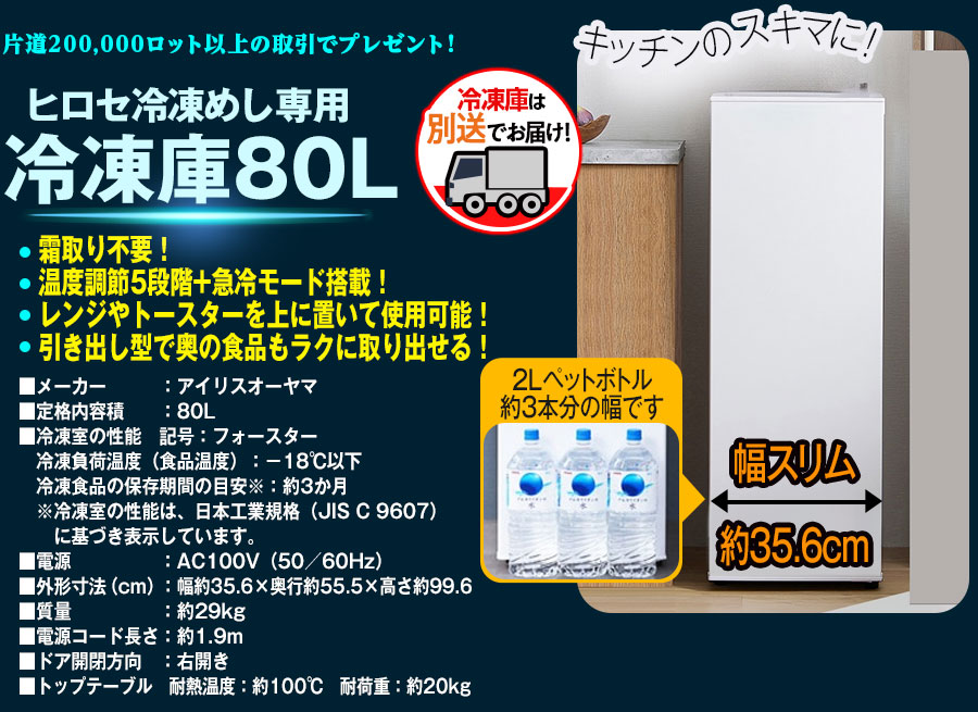 | 家電、冷凍、冷蔵商品はそれぞれ別送となります。 商品の到着日が前後する可能性がありますので、あらかじめご了承ください。 ヒロセ冷凍めし専用冷凍庫 ホワイト⁄80Lは、在庫状況によって発送が大幅に遅れる場合がございます。