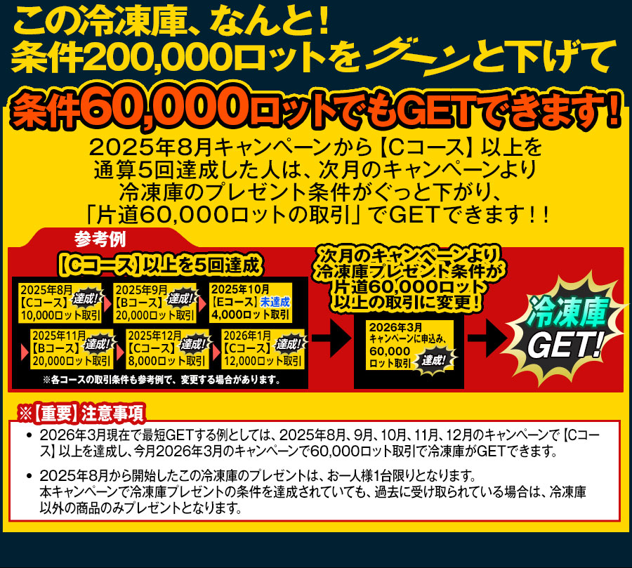 | キャンペーン期間中(2026年3月2日AM 9:00~2026年4月1日AM 8:59まで)にLION CFDで対象取引数量以上取引していただいた方に、キャンペーン商品をプレゼント! | ||