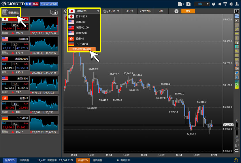 4. 銘柄の登録や削除を行う場合は、取引画面内左上の【登録/削除】をクリック、