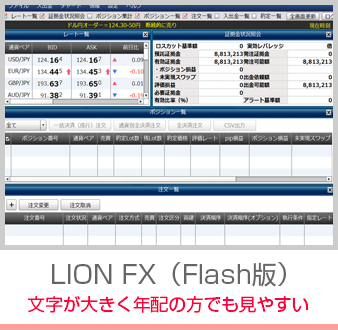 初心者の方でもわかりやすく文字の大きさやシンプルさを重視し、複雑な機能をあえてカットし作られたFlashタイプの取引システムです。年配や初心者の方にもオススメしている取引システムです。