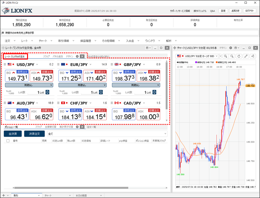 5.【レート】画面の左上に【レート:ワンクリック注文】の文字が表示されていましたら、設定は完了です。