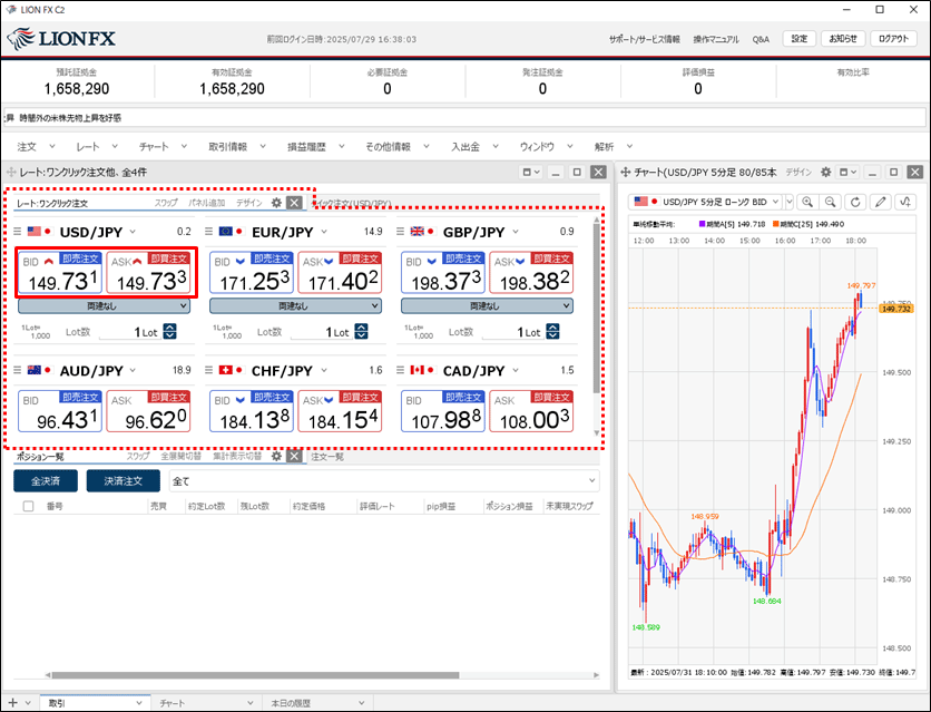 6.各通貨ペアの【即売注文】、【即買注文】をクリックするだけで、成行注文が発注されます。