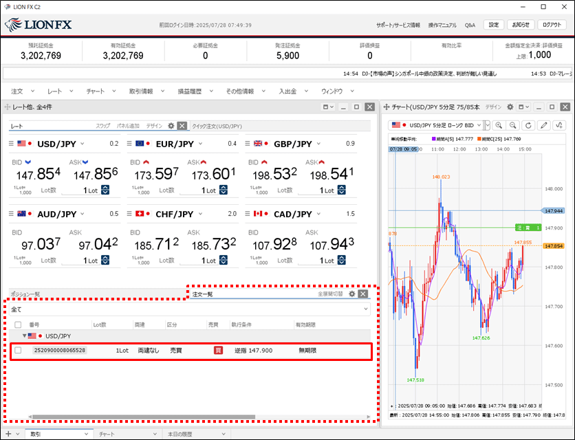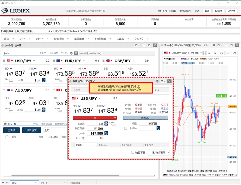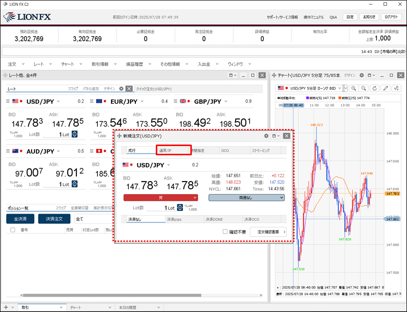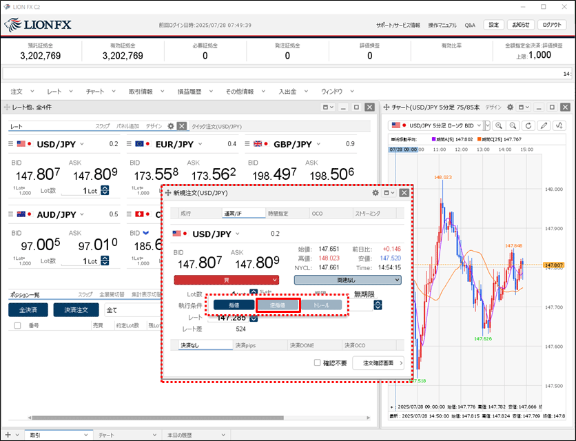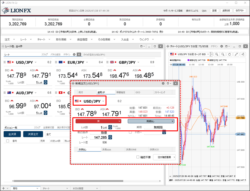 3.【通貨ペア】、【売買】、【両建】、【Lot数】、【期限】の各項目を設定します。