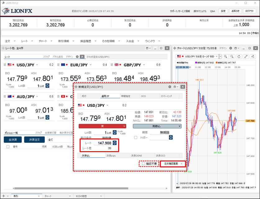 5.【レート】または【レート差】をクリックして入力し、【注文確認画面】ボタンをクリックします。