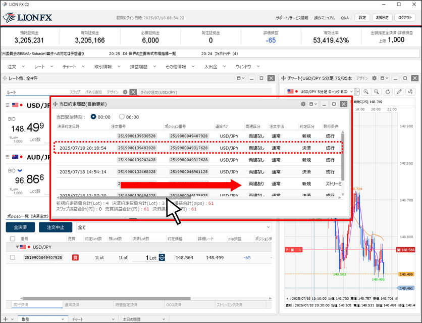 ※ポジションの表示が変わらない等があれば、必ず注文履歴で注文・約定状況をご確認ください。
