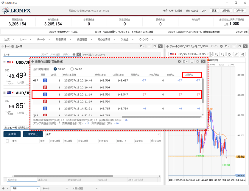 ※決済したいポジションの行を右クリックすると、決済方法のメニューが表示され、こちらから決済することもできます。