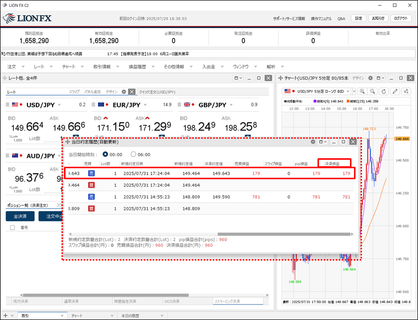 ※決済したいポジションの行を右クリックすると、決済方法のメニューが表示され選択することもできます。