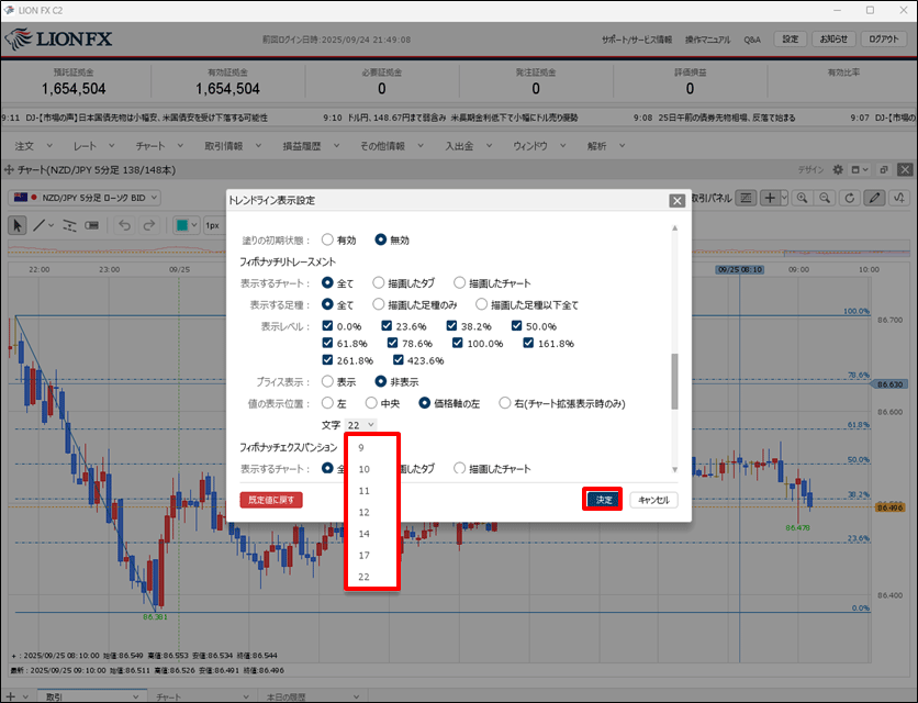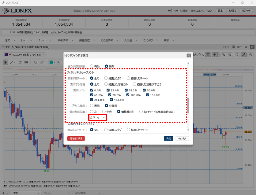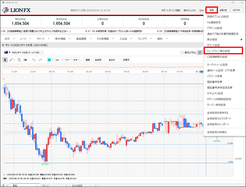 8.表示レベル(%の表示)の文字サイズを変更する場合は、取引画面右上の【設定】をクリックし、【トレンドライン表示設定】を開きます。