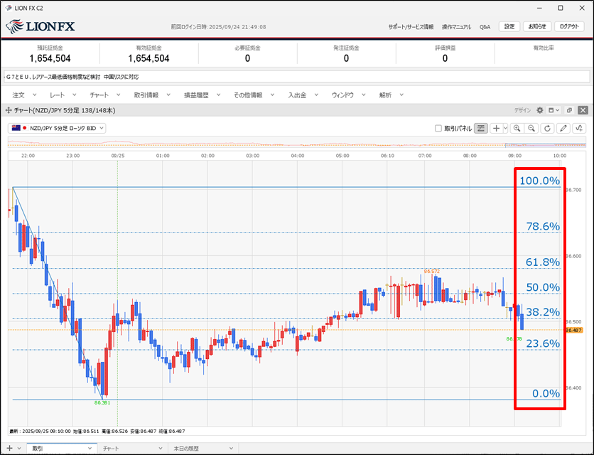 表示されている範囲の高値と安値を判断し、自動的にフィボナッチリトレースメントをチャート上に表示する機能です。